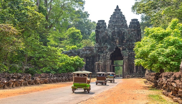 Desayuno. Empezamos con la visita de Angkor Thom. Salida en Tuk - Tuk (un tipo de motocarro, un vehículo muy típico en Camboya) hacia la puerta sur del complejo, con sus impresionantes estatuas representando el movimiento del océano. La Antigua capital de Angkor Thom (Siglo XII), el templo Bayon, único por sus 54 torres decoradas con 200 caras sonrientes de Avolokitesvara, el templo Baphuon fue construido bajo el mandato de Jayavarman I, el Phimeanakas y las terrazas del rey leproso y de los elefantes, así como las cámaras reales. Continuaremos con el Ta Prohm uno de los más espectaculares templos de la zona, el cual se ha mantenido relativamente igual que cuando fuera descubierto y retiene todavía gran parte de su misterio. Almuerzo en restaurante local.